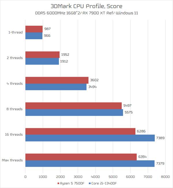 라이젠 5 7500F의 게임 성능은 어떤지, 먼저 3DMark CPU 프로파일 테스트를 통해 점검했다. 게임 엔진의 CPU 스레드에 따른 성능을 측정하는 것으로, 4스레드까지는 라이젠 5 7500F의 성능이 높지만 8스레드에서는 살짝 역전되었고, 16스레드 및 최대 스레드 테스트는 코어 i5-13400F가 더 좋은 성능을 내준다. 라이젠 5 7500F가 6코어 12스레드 모델인 만큼 당연하다면 당연한 결과다.
