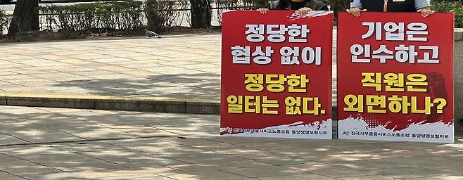 전국사무금융서비스노동조합 동양·ABL생명보험지부 노조원들은 21일 오전 11시 30분 서울 중구 우리은행 본사 앞에서 집회를 열었다. 자신들이 요구사항을 관철시키려는 목적이다. 이날 노조 측은 “인수에 성공한 우리금융지주는 현재 책임을 회피하고 있다”며 “직원들의 고용안정과 보상방안에 대해 공식적 논의에 나서야 한다”고 촉구했다. 동양·ABL생명 노조는 지난 19일부터 100% 고용승계와 기본급의 1200%에 달하는 위로금을 지급하라며 우리금융 본사 앞 피케팅 시위를 이어오고 있다.