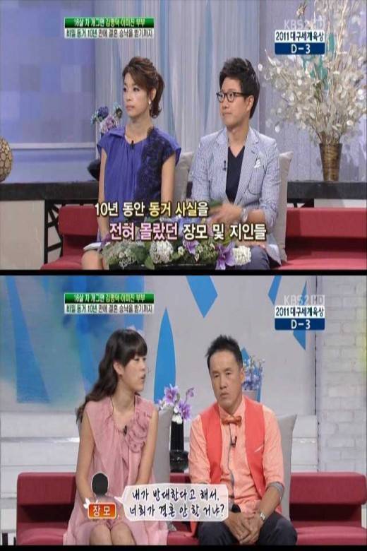 개그맨 김명덕의 16세 연하 아내 이미진 씨는 10년간의 비밀동거를 감쪽같이 속인 사연을 전했다. 두 사람은 KBS 2TV '여유만만'에 출연해 "10년 동안 동거 사실을 아무도 알지 못했다. 엄마도, 지인들도 아무도 몰랐다"라고 말했다.