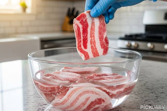 해동 시간은 10~15분이면 충분합니다. 찬물에 그냥 담그는 것보다 훨씬 빠르고, 고기도 부드럽게 녹아요. 설탕 때문에 단맛 나는 거 아니냐고요? 전혀 안 납니다. 1~2스푼은 양이 너무 적어서 맛에는 영향 없고, 해동 후 물로 한 번 헹구면 더욱 걱정 없습니다.