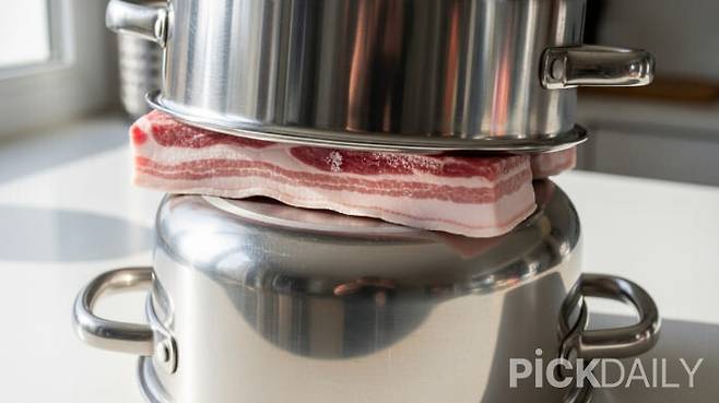 설탕물도 귀찮다 싶으면 알루미늄 냄비 활용하세요. 냄비 하나 뒤집어서 바닥에 깔고, 그 위에 냉동 삼겹살 올린 다음 냄비 하나 더 위에 얹으면 됩니다. 알루미늄의 열을 잘 전달하는 성질 때문에, 실온에 고기를 놔두는 것보다 2~3배 빨리 녹아요. 냄비 없으면 알루미늄 호일로 감싸도 비슷한 효과 납니다. 금속의 열전도율을 이용하는 원리입니다.