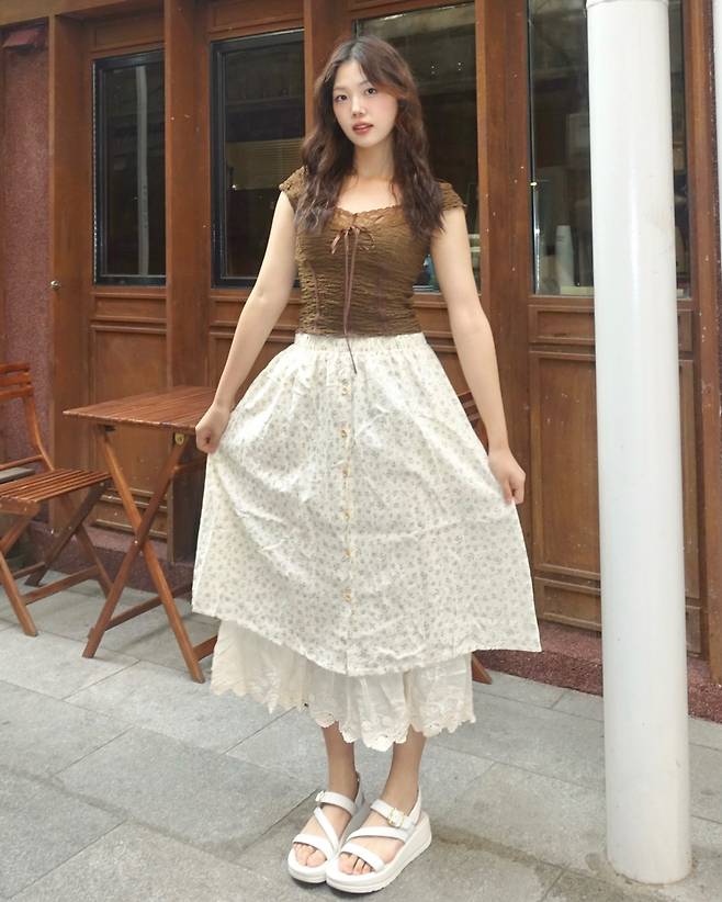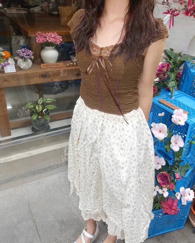 자연 속에서 이 스커트를 입고 찍은 사진은 마치 한 편의 화보 같아요.