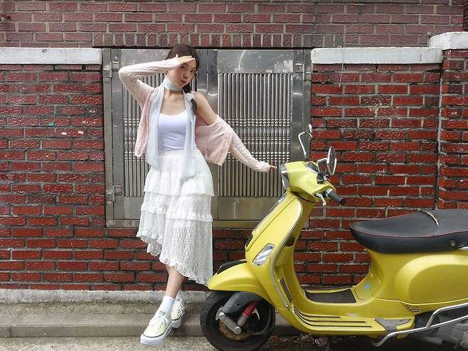 햇빛 아래에서 살랑이는 스커트 자락이 영화 속 한 장면처럼 로맨틱한 연출을 가능하게 합니다.