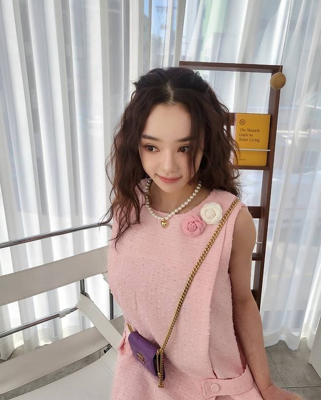 여기에 골드 체인이 돋보이는 미니 퍼플백을 매치해 사랑스러움을 극대화했습니다.