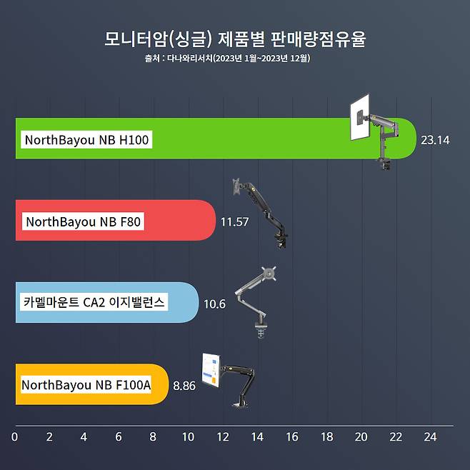 마지막으로 소비자가 선호하는 제품은 무엇이었을까? 지난해 기준 NorthBayou 브랜드 제품이 인기 제품에 이름을 다수 올린 것으로 확인됐다. 카멜마운트 CA2 이지밸런스가 10.6% 점유율로 체면을 지켰다. 5만 원 후반대 모니터 암으로 다양한 움직임을 제공한다는 장점이 있다. 카멜마운트는 국내에서 다양한 제품을 꾸준히 선보였고 인지도 또한 높은 것으로 알려져 있는데 NorthBayou 제품군 대다수가 소비자들이 민감하게 보는 가성비를 앞세운 상황이어서 그에 따른 대응 전략이 필요하다. 상위권을 차지한 모니터 암 모두 4만 원대 이하 가격대에 형성되어 있기 때문이다.