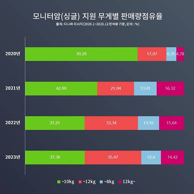 자료를 보면 모니터 암 시장의 유행은 12kg 이하 제품군으로 무게추가 이동한 상황이다. 특히 2020년, 70.29%를 차지하던 10kg 이하 제품은 2021년 42.99%로 급격히 줄더니 2023년에 와서는 37.36%를 기록한 상황이다. 반면에 2020년 17.97%를 기록했던 12kg 이하급 모니터 암은 2021년 21.94%로 세력을 넓혔으며, 2023년에는 35.47%로 2020년 대비 약 2배가량 성장했음을 확인할 수 있었다.