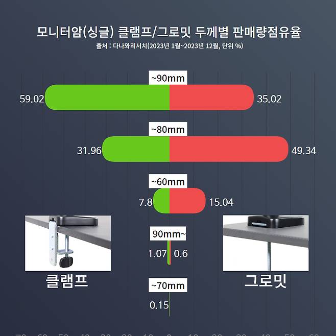 다수의 소비자는 상판 두께 90mm 이하 지원 제품을 선호하는 것으로 나타났다. 특히 이 규격에서는 클램프 방식을 선호하는 소비자가 59.02%에 달했다. 그로밋 방식을 선택한 소비자는 주로 두께 80mm 이하 지원 제품을 선호했는데 그 비중이 49.34%다. 60mm 이하부터 90mm 이상 두께를 지원하는 제품을 선택하는 소비자도 존재했지만 그 비중이 크지 않은 상황이다. 대부분 모니터 암이 다양한 두께를 지원하고 있으므로 이 같은 판매량 추이는 계속 유지될 것으로 보인다.