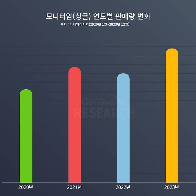 먼저 모니터 암(싱글)의 최근 4년간 판매 추이를 살펴봤다. 싱글 모니터 암은 2020년을 시작으로 꾸준히 우상향하는 모습을 보여준다. 2022년은 2021년에 비해 판매량이 약간 주춤했는데, 2020년에 비하면 증가한 것을 알 수 있다. 추가로 2023년은 2022년 대비 약 22%가량 판매량 상승을 기록, 2021년의 최고점을 갱신한 상태다. 올해 또한 상승 추세를 이어갈지 여부는 지켜봐야 할 부분이다.