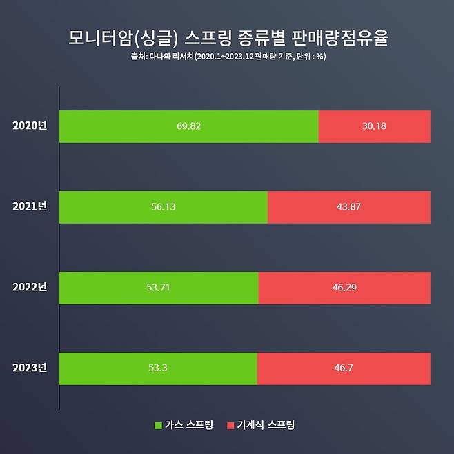 제품 방식에 따른 소비자 선택은 어땠을까? 우선 2020년에는 약 7:3 정도로 소비자가 가스 스프링 방식을 선호한 것에 비해 2023년에 와서는 53:47 정도로 팽팽해졌다. 그만큼 기계식 스프링 설계의 모니터 암이 점유율을 끌어올린 셈이다. 이는 아무래도 가격의 차이 때문으로 추측된다.