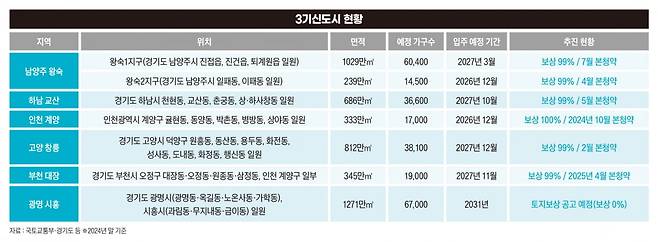 다행히 지구 지정이 늦은 광명 시흥 외에 3기신도시와 과천지구 등 다른 택지지구 상당수는 보상을 마친 상태로 지상물 철거 작업 등을 진행 중이다. 지난해 풀린 보상금 규모만 2조4000억원이다. 지난해 말부터 올해 들어 본청약을 본격적으로 진행할 수 있었던 배경이다.