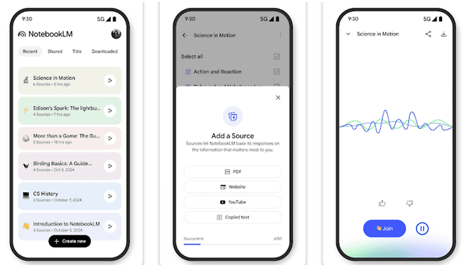 또한 모바일 환경에서 새로운 노트를 생성하거나 기존 노트를 확인하는 것은 물론 스마트폰으로 웹사이트, PDF 문서, 유튜브 영상 등을 보다가 공유 아이콘을 통해 손쉽게 노트북LM에 새 자료로 추가할 수 있다. 각 노트에 이미 업로드된 자료들도 한눈에 확인 가능하다. 사용자의 기기 시스템 설정에 따라 라이트 모드와 다크 모드도 자동으로 적용된다.
