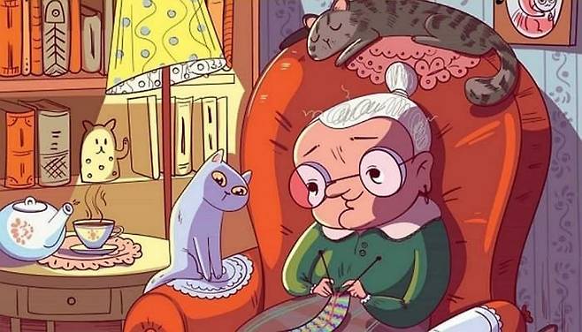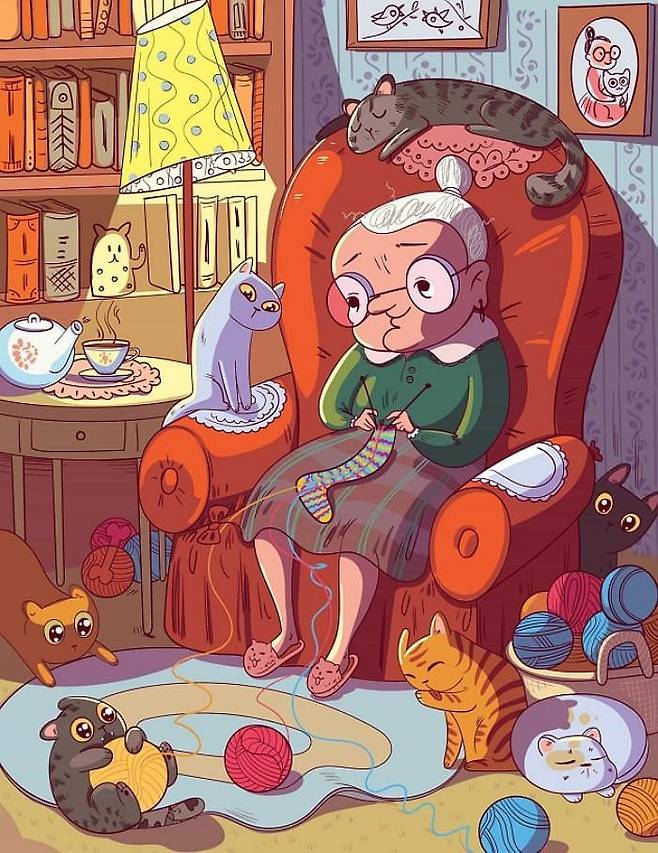 ### 관찰력 상위 1% 도전! 고양이들과 뜨개질하는 할머니 방 속 숨은 그림 찾기