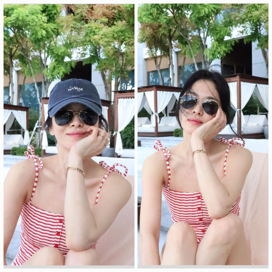 송혜교는 레드 스트라이프 패턴의 수영복을 입고 상큼하면서도 우아한 매력을 뽐냈습니다. 어깨 끈에 리본 디테일을 더해 여성스러움을 강조했으며, 베이스볼 캡과 라운드 선글라스를 매치해 과하지 않은 세련된 리조트룩을 완성했습니다. 여기에 얇은 골드 팔찌로 고급스러운 포인트를 더하며 전체적인 스타일링을 완벽하게 마무리했습니다.