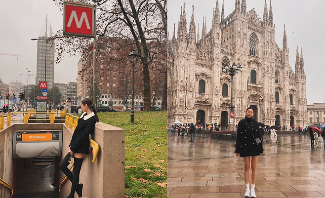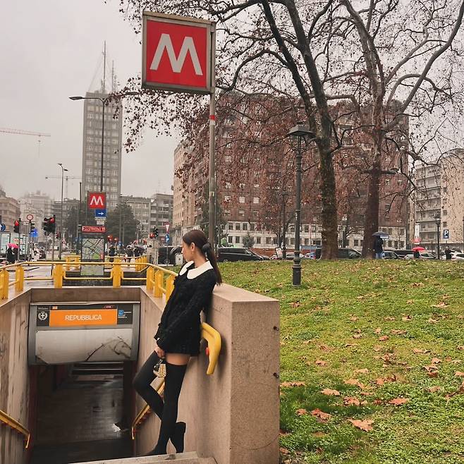 한혜진은 밀라노 지하철 입구에서 세련된 올블랙 코디네이션을 연출하고 있다. 검은색 니트 원피스에 무릎까지 올라오는 롱부츠를 매치해 도시적이면서도 우아한 분위기를 자아내고 있다. 특히 체인백을 포인트 액세서리로 활용해 심플한 룩에 고급스러운 디테일을 더하고 있다.