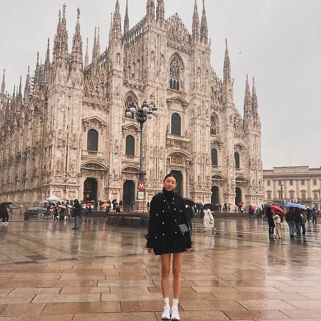 두오모 성당을 배경으로 한 겨울 패션에서는 더블브레스트 코트를 메인 아이템으로 선택했다. 검은색 롱코트에 화이트 스니커즈를 매치해 클래식함과 캐주얼함의 절묘한 조화를 이뤄내고 있다. 눈이 내리는 날씨에도 불구하고 미니멀한 실루엣으로 세련된 겨울 룩을 완성하고 있다.