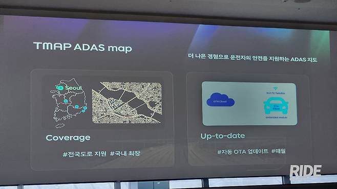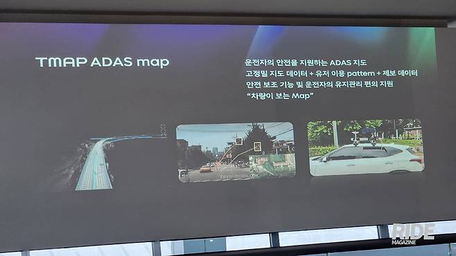 또 하나 빼놓을 수 없는 것이 주행 보조 시스템(ADAS)을 위한 지도다. 레벨 2 수준의 자율주행인 어댑티브 크루즈 컨트롤(ACC)은 앞 차와의 거리를 측정하는 센서 정도면 충분하지만, 레벨 2.5 수준인 내비게이션 기반 ACC(혹은 스마트 크루즈 컨트롤)는 커브의 곡률이나 도로 선형, 단속 카메라 등의 정보를 활용해 기능을 구현하는데 이를 자동차 제조사에서 구축하기엔 너무 광범위한 정보인 만큼 관련 내용 역시 티맵 같은 회사를 통해 지원받아 사용하게 된다. 티맵에서는 이를 위해 전국 고속도로는 물론이고 일반 국도 등까지 모두 지원하는데, 티맵의 ADAS 맵은 국내 최대 수준의 커버리지를 제공한다고.