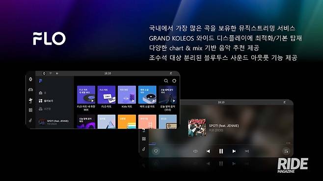 그리고 차량에서 가장 많이 사용하는 엔터테인먼트 중 하나인 음악의 경우 국내에서 가장 많은 곡을 보유한 스트리밍 서비스인 플로(FLO)를 통해 다양한 방식으로 추천 음악을 제공한다. 여기에 그랑 콜레오스의 기능 중 하나인 조수석 분리 재생으로 블루투스 장치를 통해 독립 출력을 제공하는 기능까지 갖추고 있다. 이 밖에도 오디오북, 팟캐스트, 뉴스 음성 서비스 등 다양한 앱을 티맵 스토어를 통해 제공하기 때문에 언제든 원하는 앱을 다운로드받아 편리하게 사용할 수 있다.