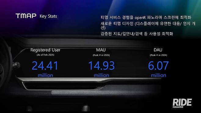 이렇게 뛰어난 사용 편의성을 보여줄 수 있는 건 티맵의 높은 사용자수에 있다. 2025년 2월 기준 등록 사용자수는 2,441만 명, 최대 월간 활성화 이용자 1,493만 명(2024년), 최대 일간 활성화 이용자 607만 명(2024년)이라는 국내 최대 유저풀을 기반으로 한 데이터를 쌓아오고 있기 때문이다. 여기에 사용자 피드백을 바탕으로 최적화 및 개선 작업을 통해 처음 사용하더라도 어려움 없이 필요한 기능을 사용할 수 있다.