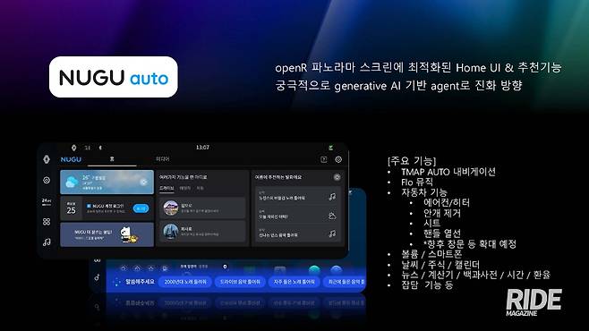 기능이 많아지면서 이에 대한 제어 역시 수월해져야 하고, 자동차 제조사들이 선택한 방법은 음성 명령이다. 시선을 돌리지 않고도 제어가 가능하다는 점은 장점이지만, 인식률이 우수하지 않으면 기능 조작이 어렵고, 정해진 명령어가 아니면 차량이 인식하지 못하는 등의 단점이 있는데 티맵에서는 누구 오토(NUGU AUTO) 기능을 탑재해 이를 해결했다. 스티어링 휠의 버튼을 누르거나 ‘아리야’를 호출해 명령을 내리면 시스템이 검색을 수행, 필요한 기능을 수행하거나 검색한 정보를 즉각적으로 제공한다. 여기에 정해진 명령어가 아닌, 평소에 사람과 대화하듯 자연스럽게 이야기하면 인공지능 시스템이 이를 판단, 원하는 기능이나 정보를 제공하기 때문에 사용에 어려움이 없다.