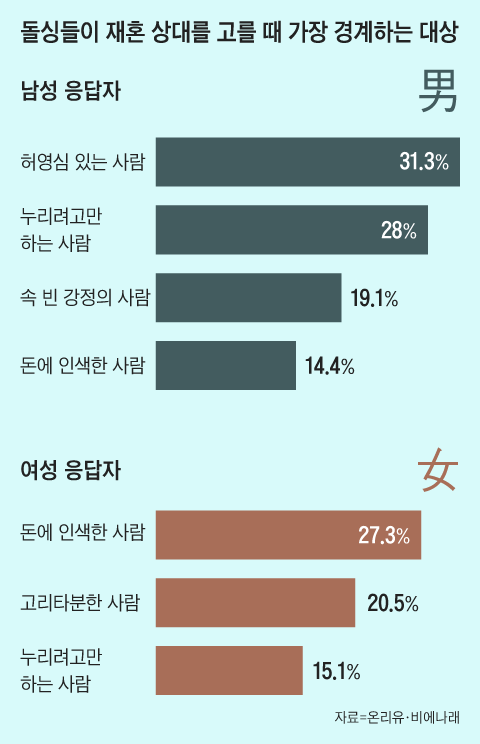 이혼 후 싱글로 돌아온 ‘돌싱’들이 재혼 상대를 고를 때 가장 경계하는 대상은 누구일까? 같은 질문에 돌싱남녀는 서로 다른 대답을 내놨다.