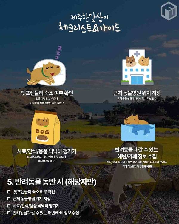 응급 상황에 대비해 근처 반려동물 병원 리스트는 필수이며, 원하는 브랜드가 없을 수 있으니 반려동물의 사료/간식/용품 넉넉히 준비하는 것을 추천드립니다. 마지막으로 반려동물 동반 가능한 해변 위치와 가볼만한 제주도 카페 정보도 미리 확보하면 여행이 훨씬 편리합니다.