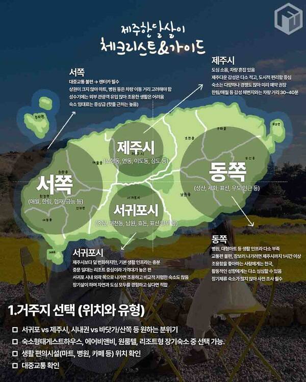 제주도 한달살기를 꿈꾸고 있다면 가장 먼저 고민할 것은 바로 거주지 선택입니다. 여행이 아닌, 한 달이라는 시간을 ‘살아야’ 하기 때문에 단순한 관광 중심지보다는 생활 인프라, 교통 접근성, 분위기까지 꼼꼼히 고려해야 하죠. 오늘 여행톡톡에서는 여러분의 제주도 한달 살기 준비에 도움이 될 수 있도록 제주 한달 살기 준비물부터 체크리스트까지 알려드리겠습니다.