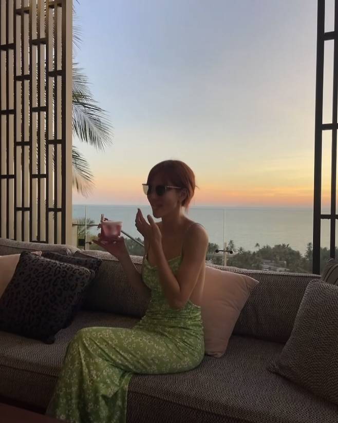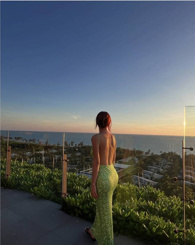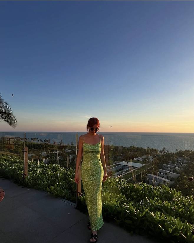 파스텔 라임 컬러의 백리스 롱 드레스를 입고 선셋 뷰를 배경으로 여유로운 무드를 발산했으며 군더더기 없이 매끈하게 떨어지는 실루엣에 작고 은은한 플라워 프린팅이 더해져 여름 감성을 극대화했습니다.