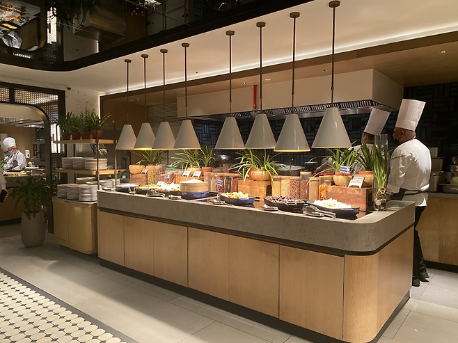 에스테이트에서는 세계 각지 요리를 맛볼 수 있다. 17~18세기 식민지에서 유행한 콜로니얼(Colonial) 양식으로 내부를 꾸몄다. 마치 여러 개의 방이 복도로 연결된 것 같은 분위기다. 아치형 복도, 라탄 장식 등 현지 느낌을 살린 인테리어 디자인이 돋보인다. 한 번에 358명을 수용할 수 있다. 조식으로는 싱가포르 등 동남아 현지식은 물론 중국계를 겨냥한 다양한 콘지(Congee, 멥쌀로 만든 걸쭉한 죽) 요리 섹션, 채식주의자를 위한 요리 등 다양한 음식을 맛볼 수 있다. 저녁에는 메뉴가 더 다양하다. 싱가포르식 소프트 쉘 크랩, 와규 소고기 국수, 블랙 트러플 구운 오리 등 음식 종류가 조식보다 더 많다.