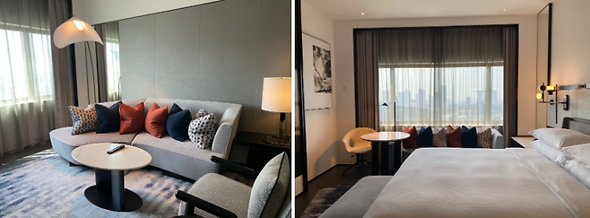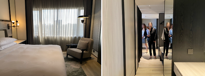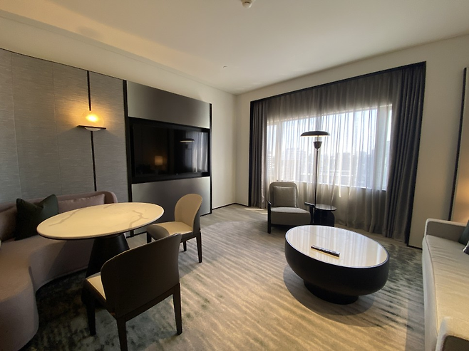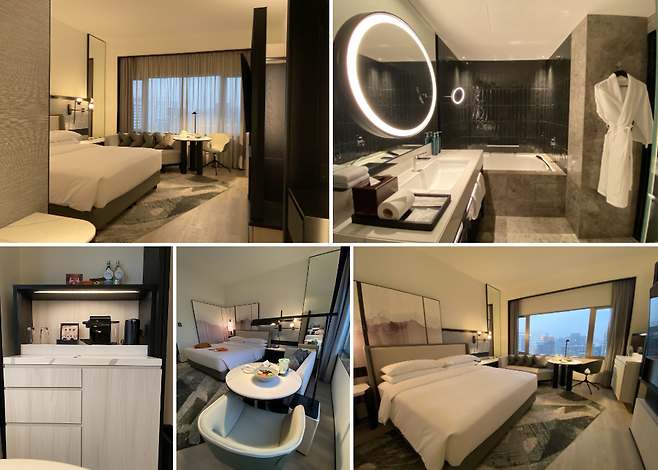 객실은 깔끔한 분위기로 꾸몄다. 적당히 톤 다운한 인테리어에서 편안함이 느껴진다. 기본 객실에서도 노트북을 펼쳐놓고 작업할 수 있도록 둥근 탁자와 의자를 따로 배치했다. 처음에 방에 들어가서 옷장을 찾느라고 애를 먹었다. 화장실 앞 좁은 옷걸이가 전부인가 실망하려던 때 TV 뒤로 시선이 갔다. TV 장 뒤편 양쪽 공간을 활용한 개방형 옷장이 보였다.