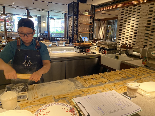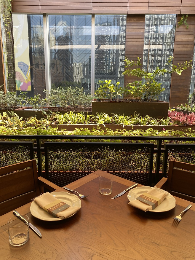 오스테리아 모짜에는 야외 정원이 있다. 이곳에서 총 20종류의 식물을 기른다. 3~4종류의 식물은 셰프가 직접 향신료로 만드는데 사용한다. 낸시 셰프는 본래 제빵으로 요리에 입문했다. 세드릭 총지배인이 추천한 메뉴는 화덕 피자다. 3일 동안 피자 도우를 숙성시켜 피자를 만든다.