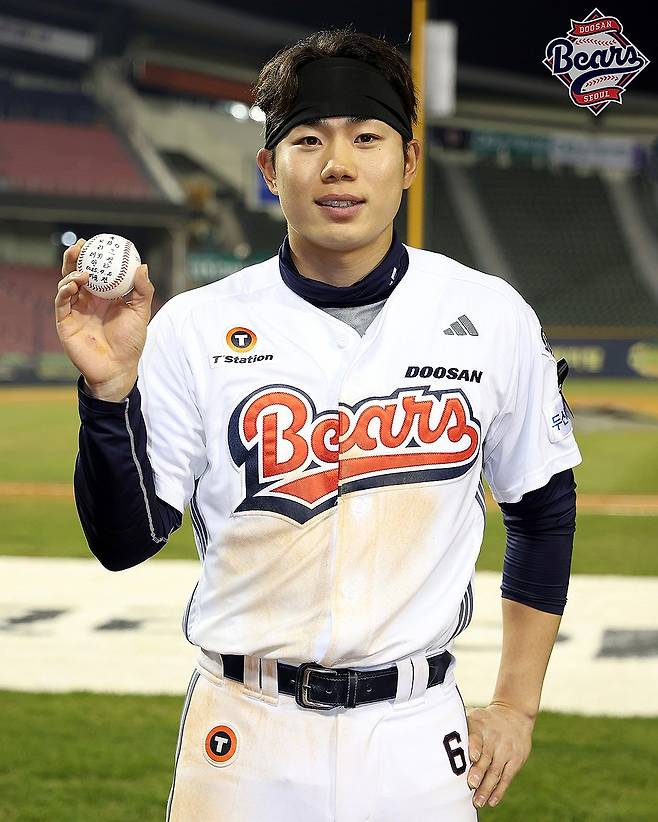 (서울=연합뉴스) 2일 서울 잠실야구장에서 열린 2025 신한 SOL뱅크 KBO리그 키움 히어로즈와 두산 베어스의 경기. 4회말 1사 1군 무대 첫 안타를 친 두산 오명진이 경기가 끝난 뒤 기념 촬영하고 있다. 2025.4.2 [두산 베어스 제공. 재판매 및 DB 금지]