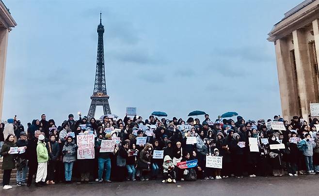 | ▲ 12월 7일 파리 트로카데로 인권 광장에서 열린 파리 교민들의 윤석열 탄핵 촉구 집회 . 프랑스 전역은 물론, 유럽 각지에서 집회 참석을 위해 달려온 300여명의 교민, 학생들이 모여, 탄핵의 그날까지 저항의 결의를 다졌다. |