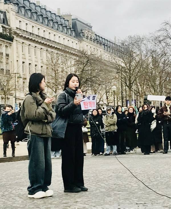 | ▲ 자신들을 각각 박종철 열사와 이한열 열사의 후배들이라고 밝힌 두 여학생이 암스테르담에서 기차를 타고 파리까지 달려와 집회에 참석하게 된 사연을 전했다. 권력을 사유화 하여 시대를 역행시키는 권력자의 파렴치함에 분노했지만, 침착하고 담대하게 거기에 맞서는 시민들의 모습에 희망을 얻었다고 이들은 말했다. |