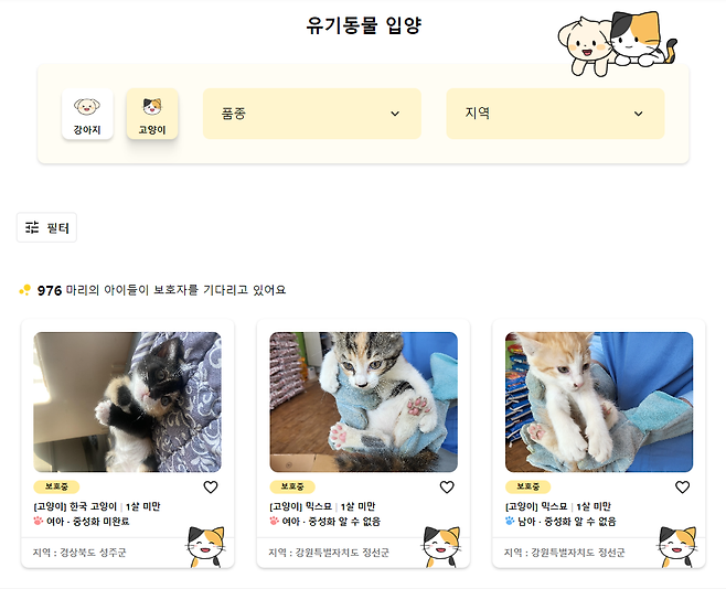 또한, 필터를 설정하여 보호 상태, 나이, 성별, 중성화 여부 선택이 가능한데요. 만약 사정이 있어 아이의 성별이나 중성화 여부가 중요한 경우에는 해당 필터 기능을 사용하여 우리 가족이 될 고양이를 입양할 수 있어요.