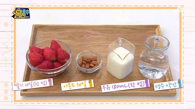 재료: 딸기 10알(한 컵), 아몬드 30알, 우유 180ml(한 컵), 생수 약간