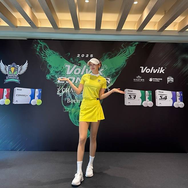 볼빅 로고와 2025 시그니처 그래픽이 펼쳐진 백드롭 앞, 문정현이 상큼한 레몬 옐로 룩으로 시선을 모은다. 무대 조명 아래 선명한 컬러 대비가 살아나며 ‘문정현’, ‘볼빅’, ‘골프웨어’ 핵심 키워드가 한 프레임 안에서 완벽히 각인된다. 양팔을 펼친 위트 있는 포즈까지 더해져 브랜드 이벤트 현장을 화보 같은 순간으로 바꿔놓는다.