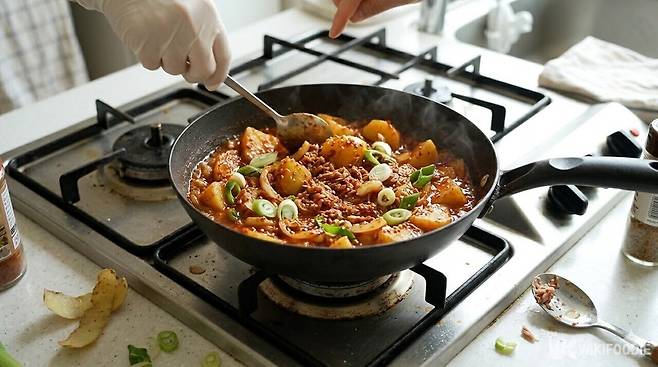 양념이 고루 섞이도록 가볍게 저어준 뒤 뚜껑을 덮는다. 불세기를 중불로 맞추고 딱 10분 동안만 기다리면 된다. 뚜껑을 덮고 조려야 감자 속까지 양념이 깊게 스며들고 수분이 너무 빨리 증발하는 것을 막을 수 있다. 10분이 지나면 국물이 자작하게 줄어들며 먹음직스러운 빛깔이 난다.