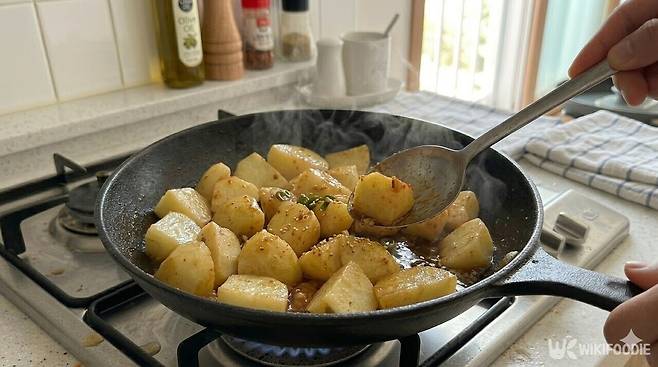 5. 감자가 포슬포슬하게 익으면 불을 끄고 참기름과 참깨를 뿌려 완성한다.