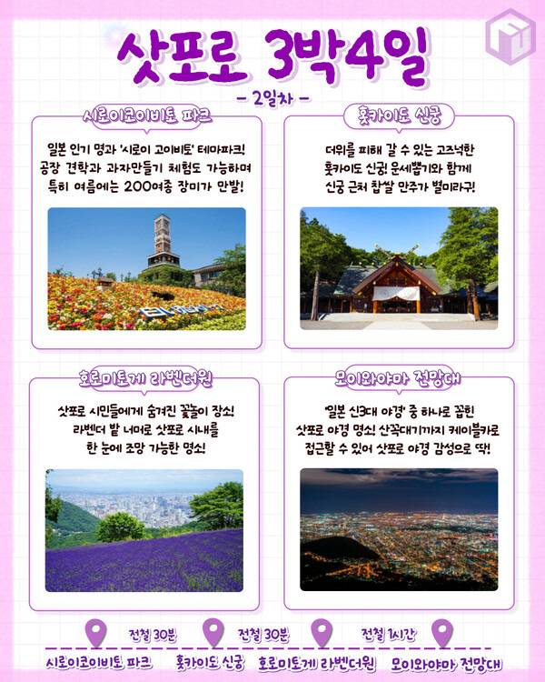 여름 홋카이도는 삿포로만 둘러보고 돌아가기엔 너무도 넓고, 아름다운 지역이 많습니다. 짧은 일정이더라도 하루 정도 더 여유가 있다면, 삿포로 근교 또는 홋카이도 명소를 함께 들러보는 것을 추천드려요.