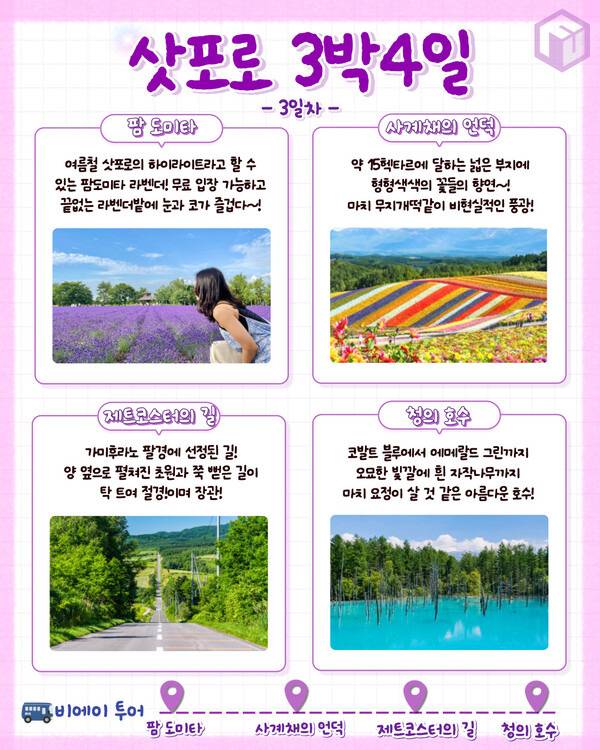 셋째 날은 본격적인 근교 여행으자 여름 삿포로의 하이라이트인 삿포로 라벤더 투어입니다. 삿포로에서 차로 약 1시간 반 거리의 꽃 명소 비에이를 하루 동안 돌아보는 코스로 다양한 투어상품이 있어 편리하게 방문하실 수 있습니다.