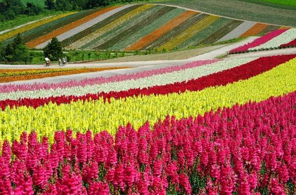 이어지는 코스는 사계채의 언덕입니다. 무지갯빛 꽃밭이 펼쳐지는 비현실적인 풍경이 유명한 곳인데요. 특히 화려한 꽃들이 무지개떡마냥 질서정연해 장관을 자아냅니다. 단, 그늘이 없어 양산과 모자를 꼭 챙겨가시길 바랍니다.