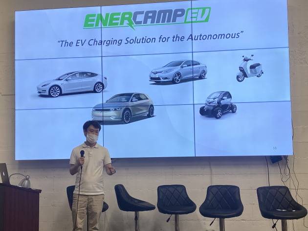 에너캠프의 충전시스템은 이동형이 가장 큰 특징입니다. 2017년 회사를 창업한 최정섭 에너캠프 대표는 "충전 인프라를 설치할 필요가 없어 초기 대규모 투자금이 들어가지 않다"며 "이동형이니 어디에나 설치가 가능하기 때문에 무한대로 확장할 수 있다"고 장점을 설명했습니다.