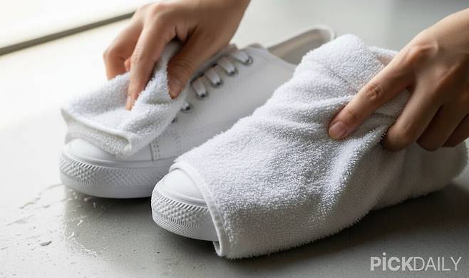 세탁만큼 중요한 게 건조 방법이다. 매달기 전엔 마른 수건으로 신발 전체를 한 번 닦아주면 좋다. 표면의 물기를 먼저 제거하면 마르는 속도가 더 빨라진다.
