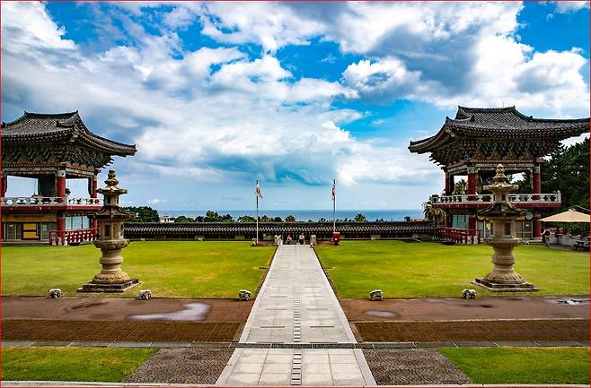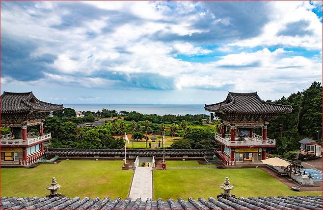 법당 뒤편으로 돌아서면, 제주 바다를 품은 사찰 풍경이 펼쳐집니다. 탁 트인 이어도로 너머로 펼쳐지는 바다를 배경으로, 느릿하게 흐르는 공기 속에서 잠시 멈추는 감각을 느낄 수 있습니다.웅장하지만 동시에 고요하고, 화려하지만 정갈한 이 사찰은 일상을 내려놓고 명상하기 좋은 장소입니다.