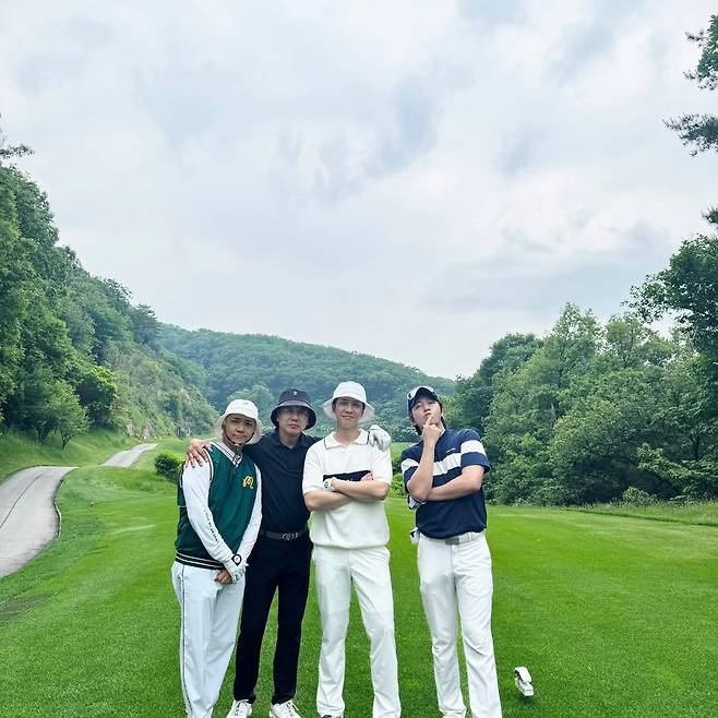 사진에는 손지창, 이승기, 장근석, 그리고 이홍기까지 네 사람이 함께 골프장 필드 위에 선 모습이 담겼다.