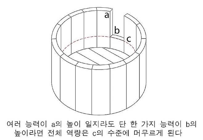 그런데 그림에서 보듯이 거의 모든 조각이 a 의 높이라고 해도, 만약 단 한 개의 조각이 b의 높이라면 이 물통에 담을 수 있는 물의 양은 b의 높이에 의한 빨간 점선의 높이 c에 그친다. 대다수의 조각이 아무리 높아도 낮은 조각 하나 때문에 전체의 역량이 높아지기 어렵다.