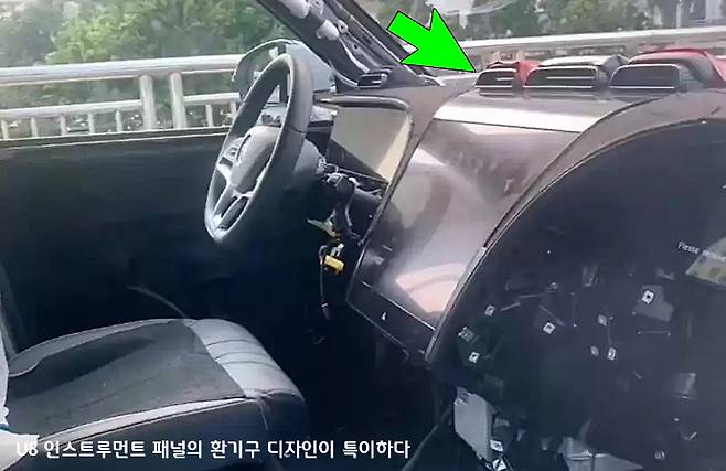 아직 U8 모델의 인스트루먼트 패널은 공식적으로 공개된 모습이 없지만, 웹사이트를 뒤지던 중에 U8 모델의 테스트 프로토타입의 실내로 보이는 사진을 발견할 수 있었다. 그리고 인스트루먼트 패널의 상부에 지붕과 비슷한 모양으로 세 개의 환기구를 만든 걸 볼 수 있다. 내외장 디자인의 아이덴티티를 추구한 걸까? 그리고 두 장의 커다란 디스플레이 패널로 구성된 것도 보인다.