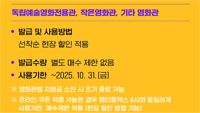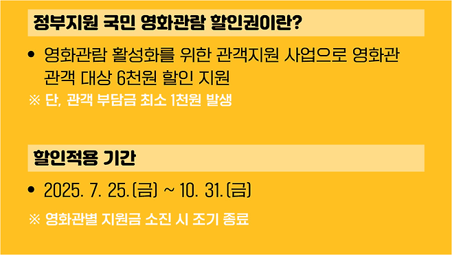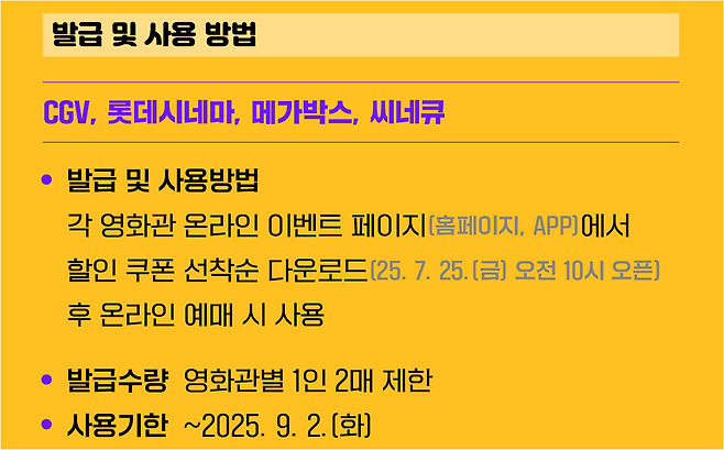 본 콘텐츠는 2025년 7월 기준 정부 공지와 각 영화관 공식 사이트 정보를 바탕으로 작성되었습니다. 실제 발급 조건, 수량, 사용 방법은 영화관 및 영화진흥위원회의 공지에 따라 변경될 수 있으므로 반드시 공식 정보를 확인하세요.