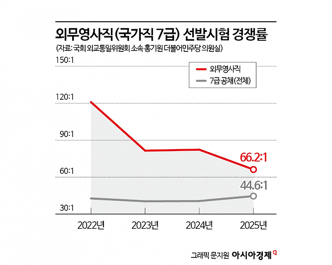 24일 국회 외교통일위원회 소속 홍기원 더불어민주당 의원이 인사혁신처로부터 제출받은 자료에 따르면 올해 실시된 외무영사직(국가직 7급) 선발시험 경쟁률은 66.2대 1을 기록해 2022년(120.9대 1) 대비 절반에 그쳤다. 같은 기간 7급 전체 공채 경쟁률이 42.7대 1에서 44.6대 1로 오른 것과 대비된다.