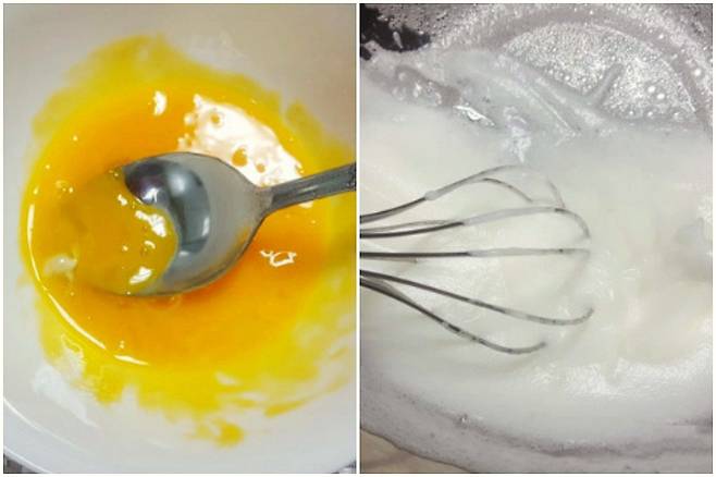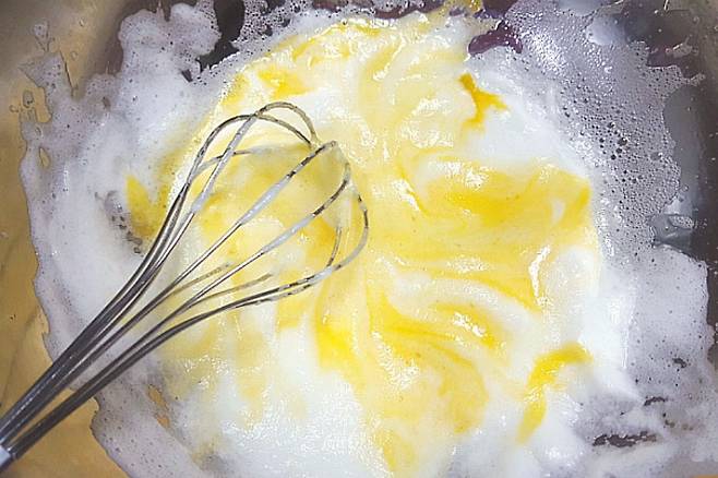 노른자는 잘 섞어두고요. 흰자는 머랭을 쳐 줍니다. 기계가 있다면 그걸 사용하시고 기계가 없다면 손으로 팔이 아프도록 열심히 저어주면 구름처럼 예쁜 머랭이 완성됩니다.